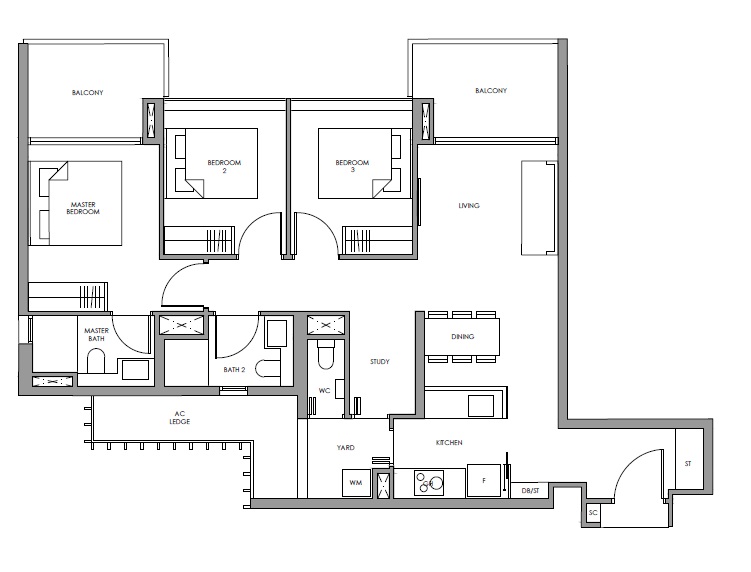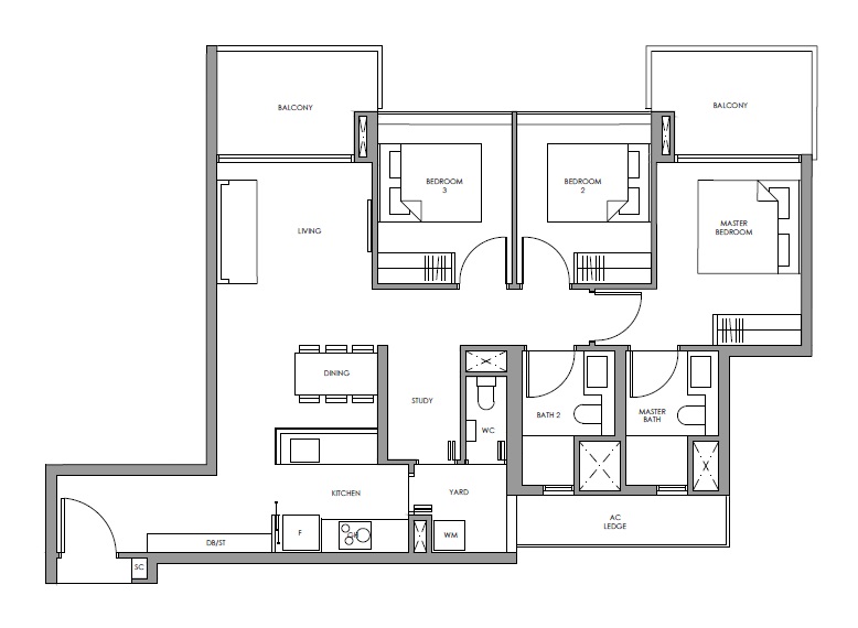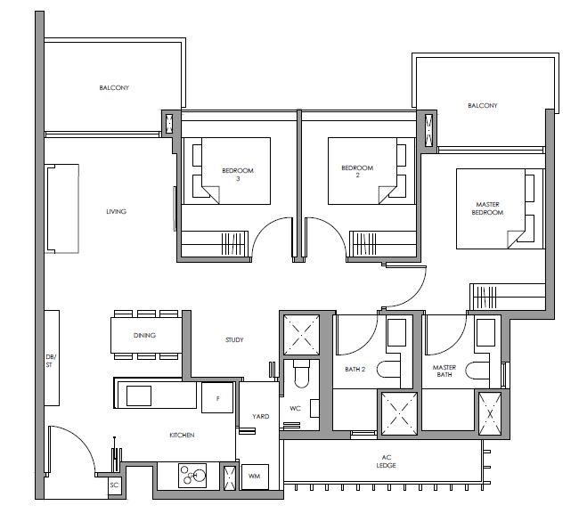 | 3 Bed + Study | 1076 - 1130 | 68 |